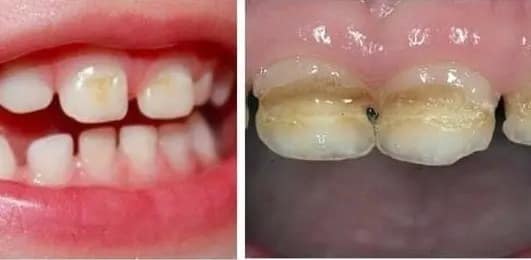 Некоторые из перечисленных факторов могут привести к гипоплазии эмали: на первых молочных зубах вы можете увидеть белые и бурые пятна, полоски, ямки или углубления.